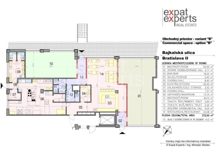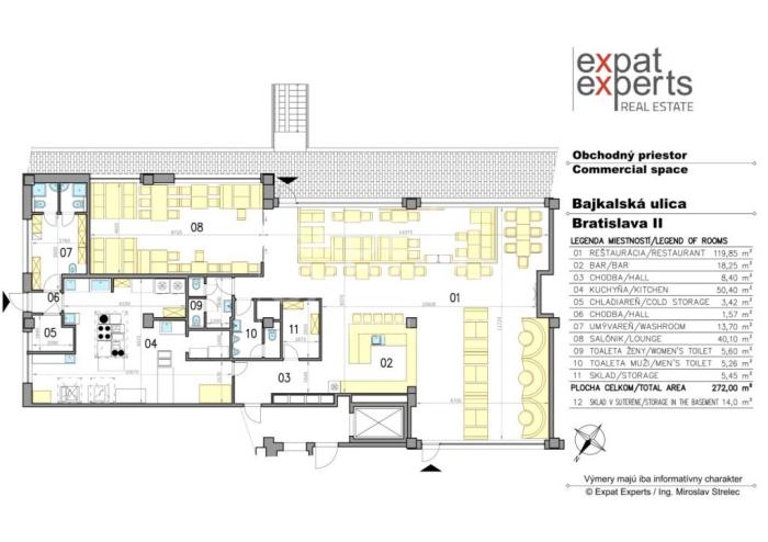 Momentálne je v priestore kompletne zariadená a funkčná prevádzka reštaurácie. Nachádza sa na prízemí 15-ročného bytového domu na Bajkalskej ulici. Nebytový priestor má 3 samostatné vstupy, čo umožňuje viaceré možnosti rozdelenia a vstupu pre klientov do jednotlivých prevádzok. Výhodou je bezbariérový vstup od vnútorného dvora a vyhradené parkovanie vo dvore