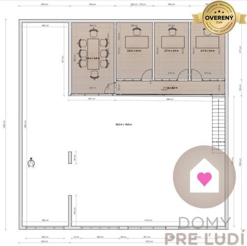 - kancelárske zázemie: 66 m² (3 kancelárie, WC a kuchynka – budú vybudované na vyvýšenom poschodí)