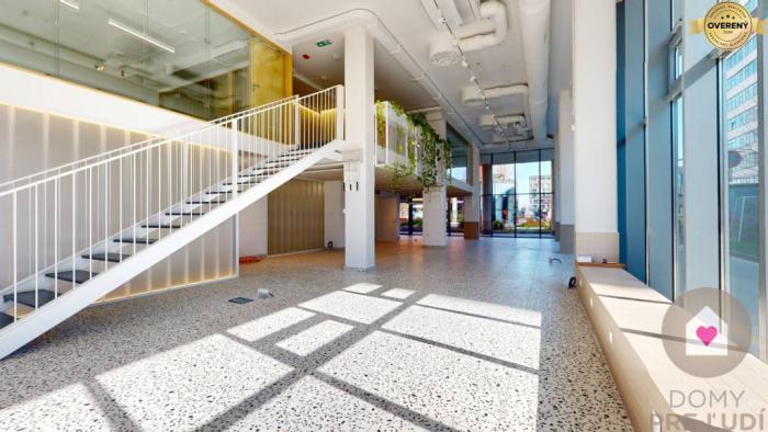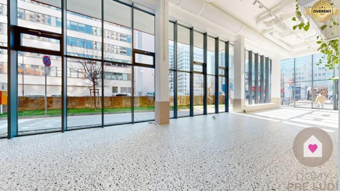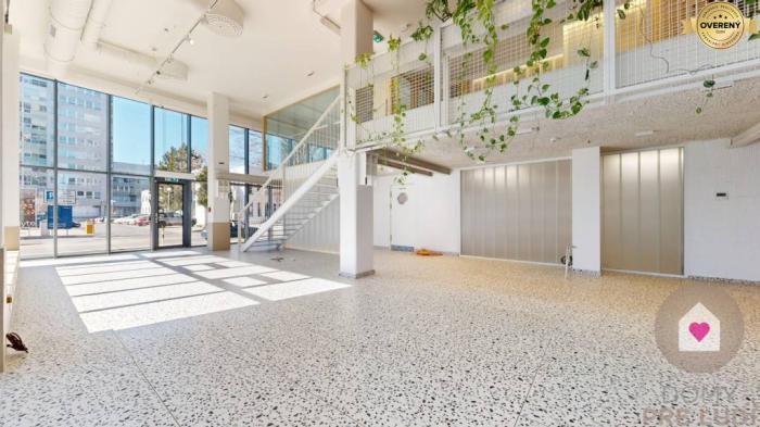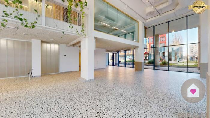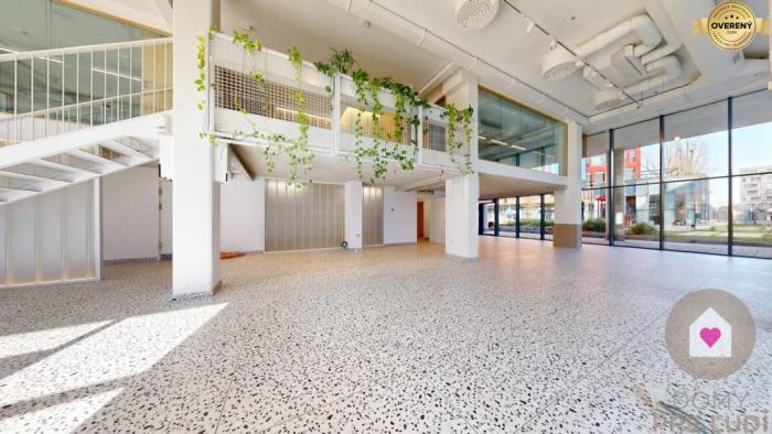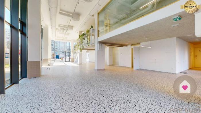 Prízemie s rozlohou 255m² ponúka priestrannú, otvorenú dispozíciu s veľkoformátovými terazzovými podlahami a oknami od podlahy až po strop, ktoré zaplavujú priestor prirodzeným svetlom. V súčasnosti priestor dispozične pozostáva z hlavnej "predajnej" časti a zázemia (kuchyňa, sklad, WC a sprcha pre personál). V rámci kuchynskej časti sú spravené vývody na plyn, elektrinu, odsávanie. Z hlavnej časti sú k dispozícii aj toalety v súčasnosti rozdelené na pánske, dámske a pre imobilných zákazníkov. Nápadné biele schodisko vedie na horné poschodie s rozlohou 145,0 m², kde sa nachádzajú kancelárske priestory so zázemím, momentálne rozdelené na 2x samostatné miestnosti (zasadačky, kancelárie) a jeden veľký open space priestor s vývodmi na kuchynskú linku a prechodom do zázemia kde sa nachádza WC, sprcha. Celé horné poschodie je riešené moderne v kombinácii sklenené priečky a koberec s podlahovými kompletmi na napojenie na elektrinu. Kancelársky priestor ponúka aj obľúbenú tichú, odhlučnenú samostatnú miestnosť na telefonovanie. Celý priestor je klimatizovaný a odvetraný cez vzduchotechniku s prívodom aj odvodom vzduchu aj s rekuperáciou. Priestor je napojený na vodu, elektrinu, plyn (aj do kuchynskej časti).