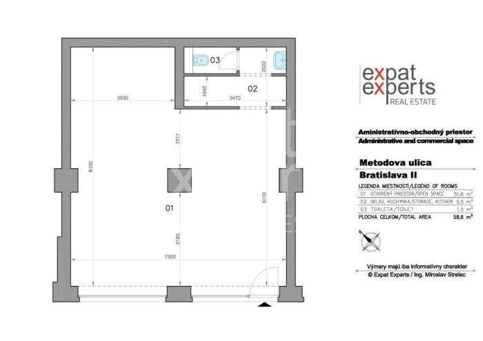 1x otvorený priestor 52m2, do ktorého sa vstupuje priamo z exteriéru, 7m2 zázemie: malý sklad, kuchynka s drezom (bez chladničky a spotrebičov), oddelená toaleta.