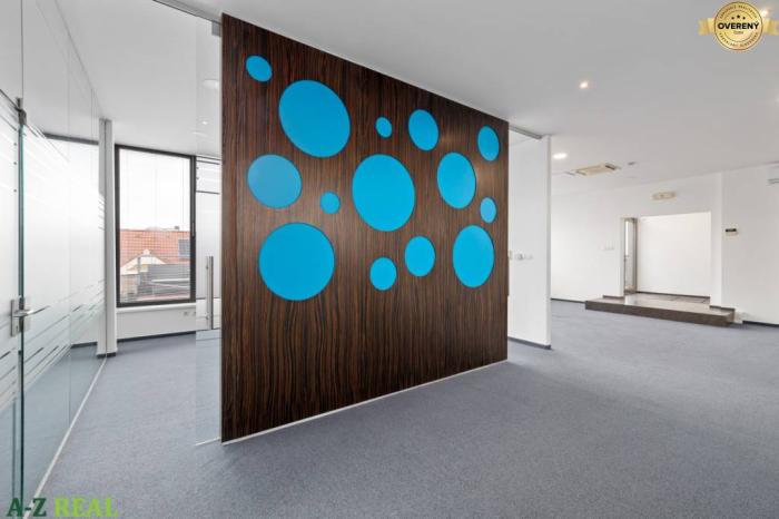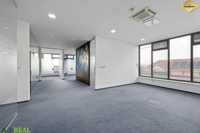 Priestory sa nachádzajú na najvyššom 4.poschodí administratívnej budovy s výťahom. Celková výmera priestoru je 150 m2. Dispozične sú priestory tvorené priestrannou vstupnou recepciou, 3 kanceláriami, zasadačkou, kuchynkou, WC a terasou s podedením s krásnym výhľadom.