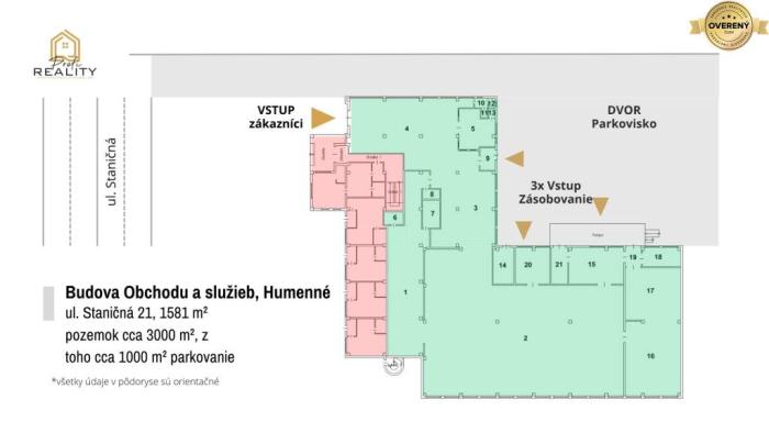 • Pozemok: Súčasťou je pozemok v okolí priestoru takmer 3000 m², z toho výmera cca 1000 m² slúžiaci na parkovanie a bezproblémový prístup kamiónov.