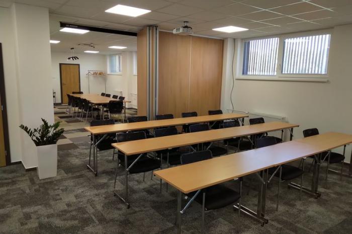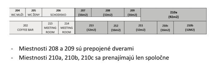 Využiteľná plocha kancel. priestorov 16m2; 32m2; 64m2. Možnosť prenájmu celého podlažia( -9 samostatných kancelárskych priestorov s príslušenstvom, v. -nákres). Zasadacie miestnosti od 6 osôb -30 osôb. Školiaca miestnosť do -40 osôb. Coworking -kancelária na jeden pracovný deň od 8hod do 17hod. K priestorom je k dispozícii na každom poschodí inovatívna kaviareň. Ceny prenájmu kancel. priestorov 16m2 -339€/mes bez DPH; 32m2 -479€/mes bez DPH; 64m2 -899€/mes bez DPH. Ceny zasadacích miestností v závislosti od počtu osôb/hodina-deň. Cena kancelárie na jeden pracovný deň -20€. Viac informácií na www.hprk.sk