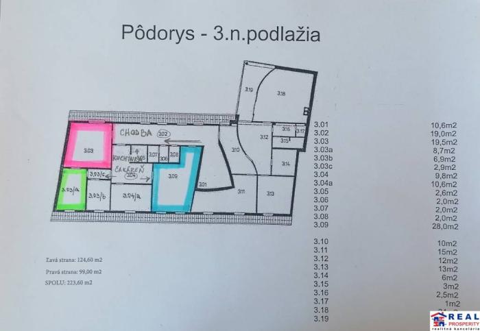 2. Výmera: 19,5 m2 /viď pôdorys - ružová farba/ - bývalá pedikúra