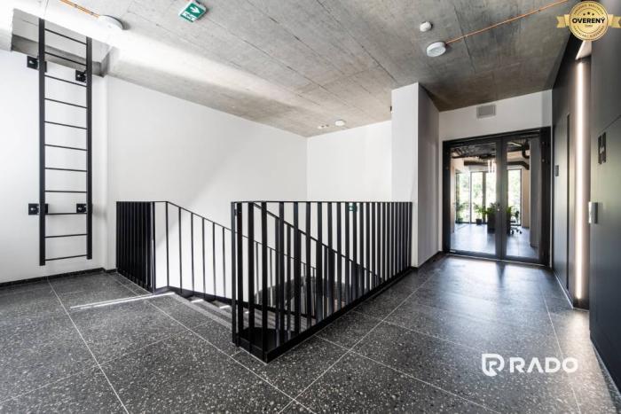 - Interiér (295 m²): gresová dlažba (protišmyková R10/A) na schodisku, hliníkové presklené dvere, kontrolovaný vstup s čítačkami kariet, hliníkové okná s izolačným trojsklom, interiérové žalúzie na kanceláriách orientovaných na JV, hliníkové dvere s bočným svetlíkom (presklené/plné).