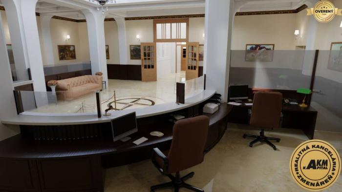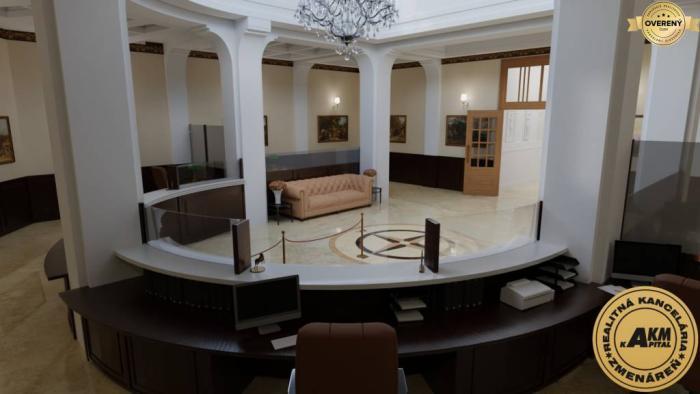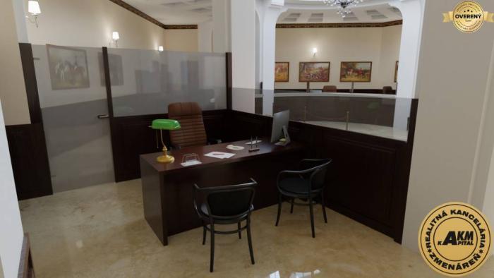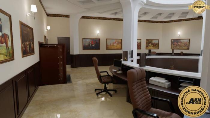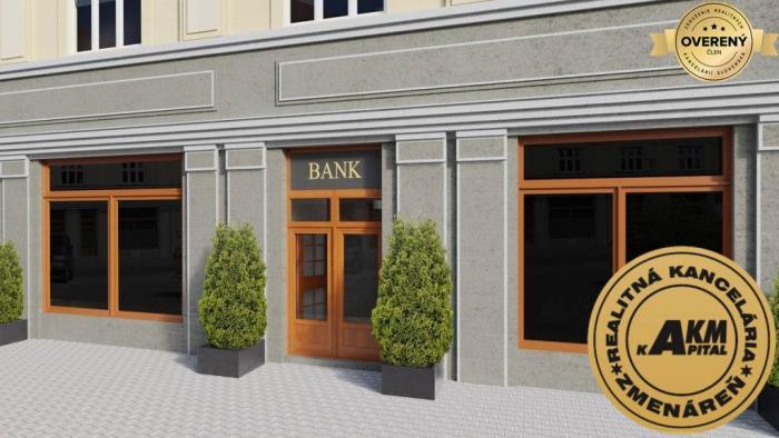 PRENÁJOM banková hala v centre mesta Zvolen. Jedná sa o lukratívny priestor o rozlohe 260 m2 úžitkovej plochy. Z toho hala cca 200 m2 a v suteréne samostatný priestor s WC cca 70 m2 ktorý je priamo prepojený s bankovou halou. Priestor banky je historicky hodnotný, ideálny na reprezentačné účely s výborným kancelárskym a sociálnym zázemím. V súčasnosti sú dokončené reštaurátorské práce a interiér je možné prispôsobiť na mieru. Budova bola postavená v roku 1927, projekt navrhol český architekt Jozef Gočár. Prenajímaný priestor je vhodný pre finančné inštitúcie, alebo luxusnú reštauráciu. Budova je výnimočná hlavne svojou polohou a architektonickým vzhľadom. Bola urobená výmena všetkých výkladov na prízemí do pôvodnej veľkosti tak, ako v čase výstavby v roku 1927.