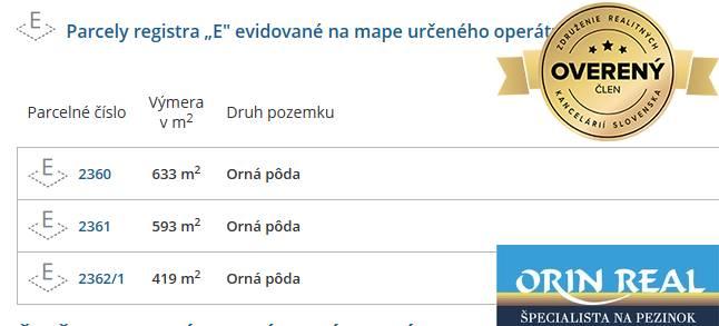 Pozemok je vhodný pre náročnejšieho klienta, kde je možné mať okolo svojho domu aj priestor na bazén a plochu na parkovú úpravu, prípadným rozparcelovaním by sa získalo viacero pozemkov. Nachádza sa v tichom a kľudnom prostredí vhodnom na relax. Rozloha je 1645m2. Skladá sa z troch parciel (633m2, 593m2, 419m2), vedie tade ale aj ochranné pásmo. Je vhodný ako investícia alebo na výstavbu viacero RD či nízkopodlažnú bytovú výstavbu. Momentálne priradené do kategorie C na liste vlastníctva.