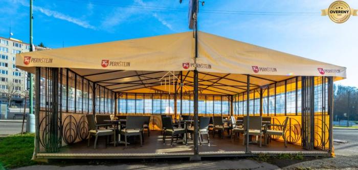 Stánok je dispozične prerozdelený na 3 časti s celkovou plochou 18m2- vstupná chodba s odkladacím priestorom, v pravo časť poskytujúca občerstvenie a ľavá časť určená na predaj novín, časopisov, malých cukroviniek a tabakových výrobkov. Vonkajšia terasa so sedením, uzavretá - chránené sedenie proti poveternostným podmienkam a vonkajšiemu mestskému ruchu rozmer 6x7m (42m2) so zdvihnutou podlahou, uzamykateľná s okrasným kovaním.