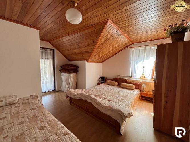 Interiér je zariadený v príjemnom vidieckom štýle s dominantnou masívnou drevenou kuchyňou a barovým pultom, ktorý vytvára útulnú atmosféru pre spoločné chvíle.