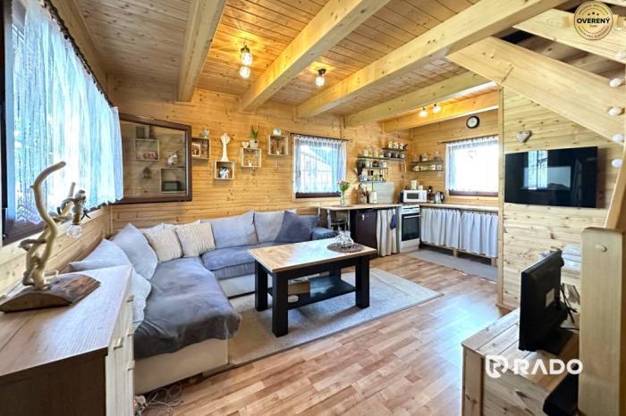 Spodné podlažie (25 m2) tvorí otvorený priestor obývačky s kuchyňou a samostatná špajza. Na horné poschodie Vás dovedú štýlové schody z masívu, nájdete tu veľkú otvorenú spálňu, kde sa plnohodnotne vyspí až 6 osôb. Ďalšie 2 osoby sa vyspia dolu na rozkladacom gauči. Celý interiér chaty je veľmi pekný, čistý a nádhernými drevenými obkladmi, ktoré umocňujú príjemnú chatovú atmosféru. Chata sa predáva spolu s kompletným zariadením.