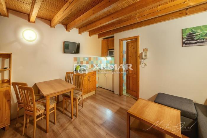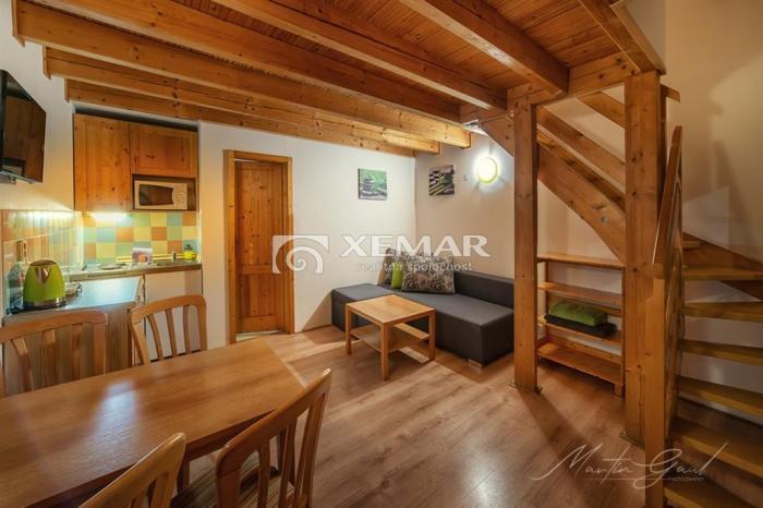XEMAR ( jozef.kret@xemar.sk alebo 0915 142 544 ) exkluzívne ponúka na predaj poschodový apartmán v Holiday Village Tatralandia v Liptovskom Mikuláši. Apartmán sa nachádza v areáli dovolenkového rezortu a je využiteľný celoročne. Rozloha pozemku je 77 m2 z toho je zastavaná plocha 29 m2. Pozostáva z obývacej izby s kuchynským kútom, kúpeľne s WC a spálne s balkónom na poschodí. Počet spacích lôžok je 4 + 2 na gauči. Apartmán sa predáva so zariadením, vybavením a s elektrospotrebičmi.• materiál Ytong,• strecha - šikmá pokrytá betónovou škridlou,• plastové okná a dvere,• kúrenie - el. konvertormi,• IS: elektrická, vodovodná a kanalizačná prípojka,• asfaltová prístupová cesta s parkovaním v blízkosti apartmánu,• mesačné náklady za elektrinu a vodu sú približne 120,- eur,Viac informácií na tel. čísle 0915 142 544