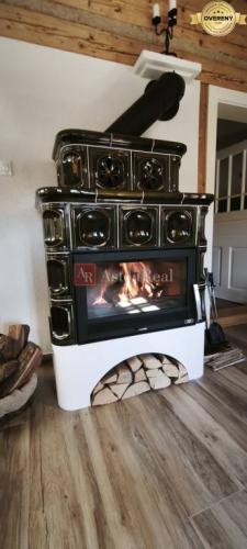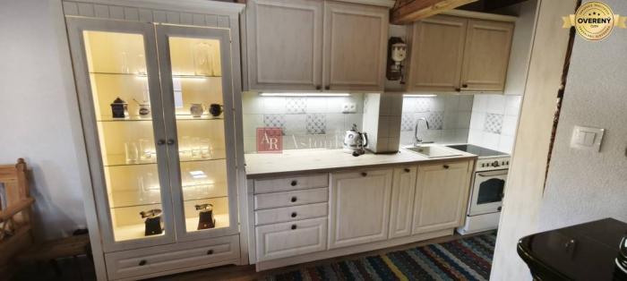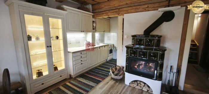 Dominantou hlavnej izby sú elegantné tmavozelené krbové kachle, ktoré vytvárajú srdce domu. Pri nich vzniká priestor na spoločné večere, rozhovory aj pokojné zimné večery po dni strávenom v horách. Kuchynský kút je vybavený kvalitnými, nepoužitými spotrebičmi, ktoré citlivo dopĺňajú charakter interiéru.