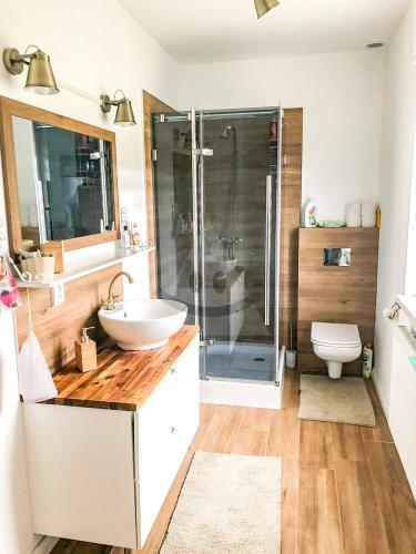 Dispozícia premyslená do detailuPrízemie:✅ vstupná predsieň✅ technická miestnosť✅ kúpeľňa s WC✅ benefit: súkromná sauna priamo v kúpeľni✅ priestranná obývacia izba prepojená s kuchyňou✅dominantné veľkoformátové francúzske okno s priamym výstupom na 35 m² slnečnú terasuDenná zóna je otvorená, presvetlená a prirodzene prepojená s exteriérom. Práve veľké francúzske okno vytvára pocit spojenia interiéru s prírodou a prináša do priestoru množstvo prirodzeného svetla.Poschodie:✅ 3 samostatné izby✅ kúpeľňa s WC✅ z toho dve izby s priamym výstupom na balkón